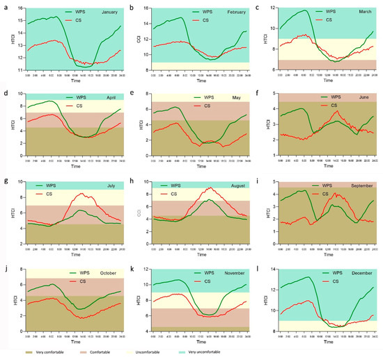 In January, February, March, April, October, November, and December, the HTCI in both the WPS and CS exhibited an increasing trend, then a decreasing trend, and finally rebounded. Two relationships existed between the WPS and CS in terms of the magnitude of the HTCI. Take February as an example. The HTCI in the WPS was lower than that in the CS during the period of 9:45–17:00, while it was higher than that in the CS in other periods (Figure 6b). The same relationship occurred in January, March, April, and December. In contrast, in October and November, the daily HTCI values in the WPS were higher than those in the CS in all time periods.