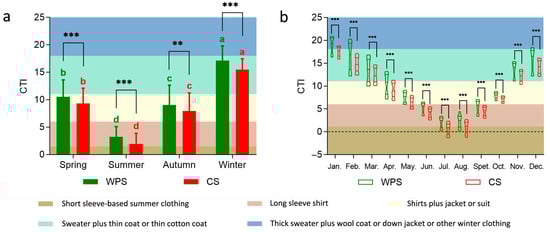 As shown in Figure 7a, the CTI values in the WPS were all higher than those in the CS in all four seasons (p < 0.01). The CTI in the WPS and CS exhibited significant seasonal variations (p < 0.05), with winter displaying the highest values (17.14 and 15.49). This belongs to level IV, so a sweater in addition to a thin coat or thin cotton coat is recommended for outdoor activities. Summer had the lowest variations (3.21 and 1.94). This belongs to level II, so a long-sleeve shirt is recommended for outdoor activities. Spring (10.50 and 9.32) and autumn (9.03 and 7.93) ranked in the middle. These belong to level III, so a shirt in addition to a jacket or suit is recommended for outdoor activities.