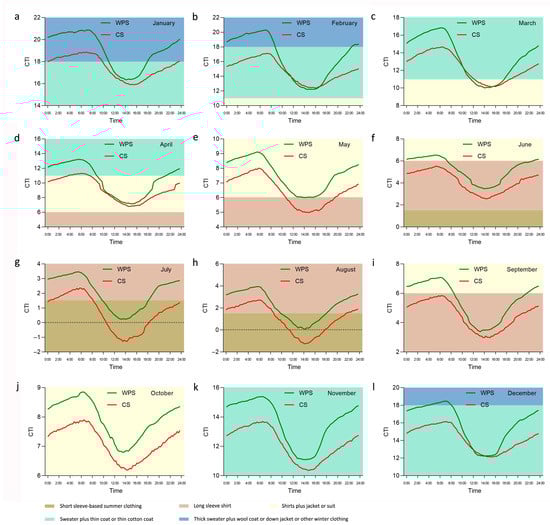 Clothing suggestions are further discussed based on the daily variation of the CTI. In January, the daily variation of the CTI in both the WPS and CS was reduced from level V to level IV before increasing to level V (Figure 8a). In February, the daily variation of the CTI in the WPS reduced from level V to level IV before increasing to level V, while that in the CS stayed in level IV over the whole day (Figure 8b). In March, the daily variation of the CTI in both the WPS and CS was reduced from level IV to level III before increasing to level IV (Figure 8c). In April, the daily variation in the WPS was reduced from level IV to level III before increasing to level IV, while that in the CS increased from level III to level IV before reducing to level III (Figure 8d). In May, the WPS stayed at level III over the whole day, while that in the CS was reduced from level III to level II before increasing to level III (Figure 8e). In June and September, the daily variation of the CTI in the WPS was reduced from level III to level II before increasing to level III, while that in the CS stayed at level II over the whole day (Figure 8f,i). In July, the daily variation of the CTI in the WPS was reduced from level II to level I before increasing to level II, while that in the CS increased from level I to level II before reducing to level I (Figure 8g). In August, the daily variation of the CTI in both the WPS and CS was reduced from level II to level I before increasing to level II (Figure 8h). In October, both the WPS and CS stayed at level III over the whole day (Figure 8j). In November, both the WPS and CS stayed at level IV over the whole day (Figure 8k). Finally, in December, the daily variation of the CTI in the WPS increased from level IV to level V before reducing to level IV, while the CS stayed at level IV over the whole day (Figure 8l).