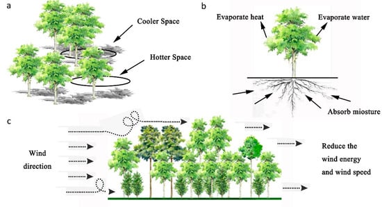Schematic diagrams of the (a) shading, (b) transpiration, and (c) wind barrier effects of plant communities.