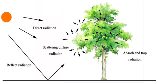 A diagram of the absorption and diffuse reflection of solar radiation by plants.