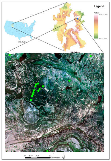 The study area is located in the mountainous area in the Greater Yellowstone Ecosystem. The green circles represent the final 15 plots that we chose for this study.