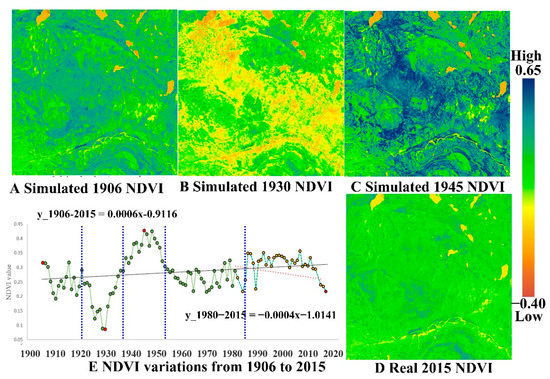 The simulated NDVI images for (A) 1906, (B) 1930, (C) 1945, and (D) real NDVI in 2015. (E) Distribution of the median NDVI values for the annual NDVI maps where the red dots correspond to the NDVI maps in 1906, 1930, 1945, and 2015. The green dots in the plot represent the simulated data from 1906 to 1979, and the yellow dots represent the real data from 1980 to 2015. The gray solid line and red dash line are the tendency lines from 1905 to 2015 and from 1980 to 2015, respectively. The outliers (2012) were excluded due to the lack of available satellite images. The blue dashed lines represent the four breakpoints of a regime shift.