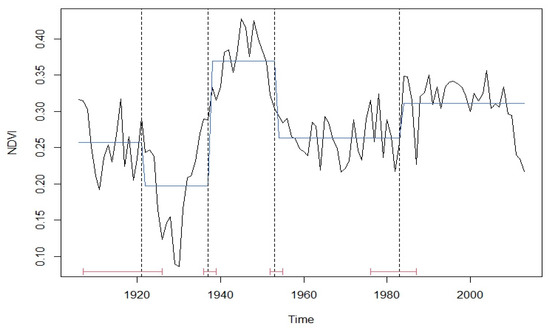 After classifying the land cover and conducting linear regression for each pixel, we determined the NDVI values in each grid cell from 1906 to 1979. Among cells in the study area, we averaged annual NDVIs for each type of land cover (forest, grass, rock, and water) and compared the overall NDVIs with them. Time series analysis for the NDVI from 1906 through to 2015 was also performed using the strucchange package in R [35], the most widely used method to identify regime shifts. The program identifies breakpoints (step change in the mean) in the NDVI time series via an estimation based on the minimization of the residual sum of squares (RSS) within the series and the Bayesian Information Criterion (BIC) score for scoring the optimum number of breakpoints [35] along with the calculation of confidence intervals based on equations from [36]. We then explored the relationships between NDVI and local climate using precipitation, temperature, and PDSI in our model.