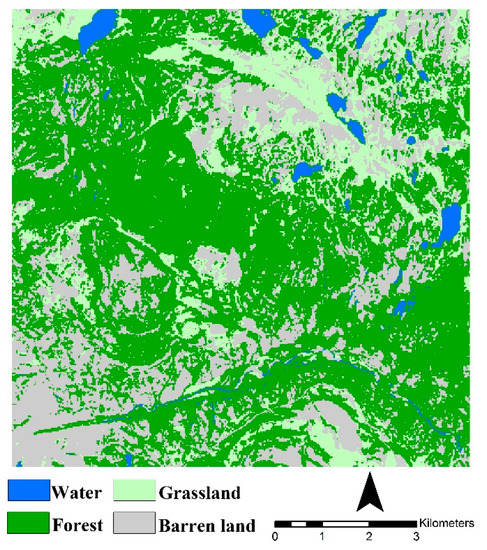 Our study area (Figure 1) is located on the northeast of the Greater Yellowstone Ecosystem. The average temperature is around 8 °C in summer (June through August) and −7 °C in winter (December through February). The annual rainfall is 510 mm. The plot sites were located on the slopes of mountainous areas in the Greater Yellowstone Ecosystem. The study site is laid out along an elevation gradient in a 12 km × 12 km area. The dominant trees are lodgepole pine (Pinus contorta Douglas) and whitebark pine (Pinus albicaulis Engelm.), whose mortality increased a lot when the temperature reached around −10 °C in the growing season [22,23], and due to the mountain pine beetle (MPB, Dendroctonus ponderosae Hopkins), and white pine blister rust (Cronartium ribicola J.C. Fisch.) outbreaks since 2000. Other common species include Engelmann spruce (Picea engelmannii Parry ex Engelm.), subalpine fir (Abies lasiocarpa (Hook.) Nutt.), and Douglas fir (Pseudotsuga menziesii (Mirbel) Franco). The study area was selected to represent the vegetation types and elevational changes in the Greater Yellowstone Ecosystem, with elevations ranging from 1170 m to 3087 m. Conventional studies have just used one pixel to represent the whole study area, and conventional research will regard the pixel as the forest where trees take up more than 50% of the area. However, instead of a pure forest pixel, the area also includes lakes, rock, and grass. We chose the 7 July 2015 Landsat 8 image from the United States Geological Survey (USGS) (https://earthexplorer.usgs.gov/, accessed on 2 August 2020) as our base image to map the land use and land cover distribution. We classified the whole area into four land covers (forest, grassland, barren land, and water) using the random forest method, which is an ensemble learning method to generate a series of decision trees for one pixel and assign it as one specific land cover with highest probabilities [24]. The whole classification had four land covers: forest, grassland, barren land, and water, with 200 samples for training and 100 samples for validation.