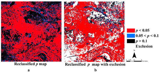 The p-value in the first level (71.14% for exclusion map) was less than 0.05, which met the conventional statistical requirement. The p-value in the second level (11.31% for the exclusion map) was between 0.05 and 0.1. If we excluded barren land and water, the ratio whose p-value (< 0.05) increased by 17% to 71.14%.