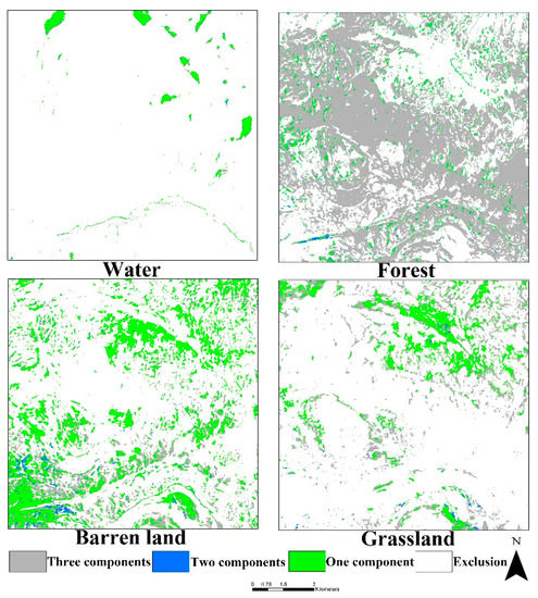 The three-component sub-model fitted 92.81% of the forest and 53.20% of the grassland even though AIC had severe penalties to the redundant parameters (Figure 6 and Table 2). About 75.37% of the water and 66.92% of the barren land were described by the first component sub-model reflecting their simple characteristics.