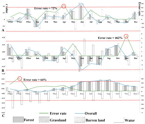 However, the range of NDVI (−1, 1) and r (0, 1) was small, so we introduced the relative error rate. The NDVI error rate between overall NDVI and forest NDVI was 10.36%. If we bring those NDVI values with high error rates into a correlation analysis with other climate factors (precipitation, temperature, and PDSI), it will cause high annual error rates for r values which average the correlations from January to December. The annual error rates for precipitation, temperature, and PDSI were 20.25%, 66.92%, and 11.00%. In some extreme months, such as precipitation in April and temperature in November, the error rates for correlations were 71.89% and 462.18%. Even though r values in these months did not meet significant levels, the error rates still indicated the big gap between forest NDVI and overall NDVI and spoiled the quality of our whole dataset. Water may play an important role in generating these big gaps because its correlation was usually opposite to those in the forest, such as precipitation and temperature in June (Water_preci = −0.10, Forest_Aug = 0.25; Water_temp = 0.23, Forest_temp = −0.21; Figure 7A,B).
