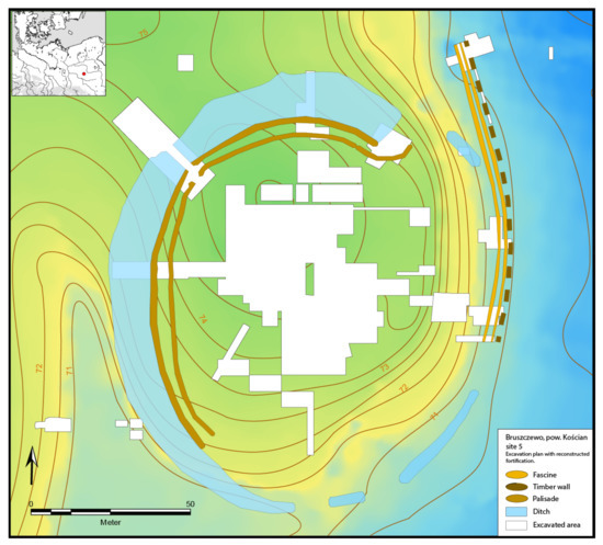 The Bruszczewo site (52°00′41″ N, 16°34′05″ E) is located in the Kościan district in Greater Poland, 60 km south of Poznań (Figure 2). The settlement is situated on a spur of an ice-age moraine hilltop, which protrudes into the now silted-up lake. The lake is still preserved today as a lowland bog through which the canalised river Samica flows. In the Early Bronze Age, the site was separated from the hinterland to the north and west by an elaborate ditch-wall system and up to three rows of palisades. To the south and east towards the lake stood a three-row fortification of two wattle walls (fascine) and sectional beam walls. These fortifications served both as defence against enemies and as protection against flooding, since rising water levels could cause a serious problem for the houses directly on the lake shore. The original proximity to the lake and the present-day lowland bog provided the best preservation conditions for organic and thus also timber material [7,8,9].