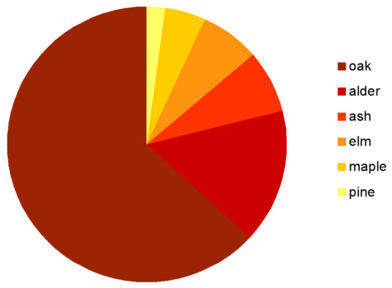 Altogether, 190 samples of wood from the Bruszczewo site were measured during this study. In the taxonomical composition, the oak wood dominated, with 120 samples belonging to this taxon. In addition to the oak, 30 alder, 14 ash, 13 elm, 9 maple and four specimens of pine (Pinus L.) were present (Figure 4). Among these wood samples, only pine is a gymnosperm genus and therefore reacts in a different way to the influence of external factors in comparison to the other, angiosperm species. Therefore, four samples classified as pine wood were excluded from further research. This decision also resulted from the fact that forest management systems discussed in this article are applied to broad-leaved trees. In addition, alder was also omitted because a specific type of growth characterises this taxon. Alder usually overgrows the wetland stands stretching along riverbanks and often located on unstable grounds. Such habitat is conducive to the frequent occurrence of reaction wood, the variable width of growth-rings, the lack of continuous growth at the entire circumference of the stem, and the existence of false rings. Therefore, these features should not be linked with the impact of forest management practices, but they instead result from natural variability of tree growth.