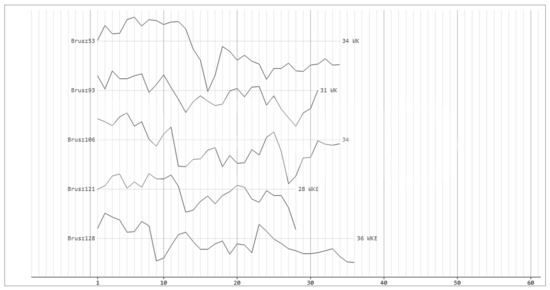 From the morphological point of view, coppiced stems are also characteristically curved at the base. This curve forms when the competing stems grow out from the stool in the early stage of the cycle, and later grow up when the canopy closes. The presence of such curves may allow the identification of coppice timber in archaeological sites [17]. However, in the case of Bruszczewo wood, the stem curvature at the base of tree was not observed. It results from the fact that the samples were preserved, in the vast majority, as small fragments of the logs.