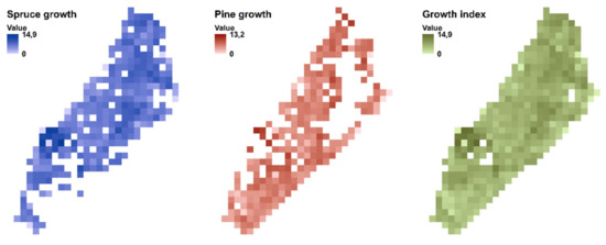 A greater value of these growths (Scots pine or Norway spruce) was selected to represent growth of the grid cell (Figure 1).