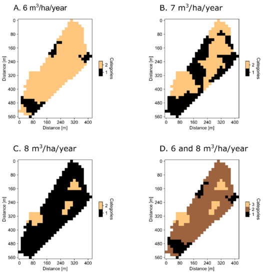 Visualization of micro-stands in study stand no. 49 categorized with single threshold values of 6 (A), 7 (B) and 8 m3/ha/year (C) and double threshold values of 6 and 8 m3/ha/year (D). (A–C): Category 1 = Scots pine, 2 = Norway spruce, (D): 1 = Scots pine, 2 = Scots pine or Norway spruce and 3 = Norway spruce.