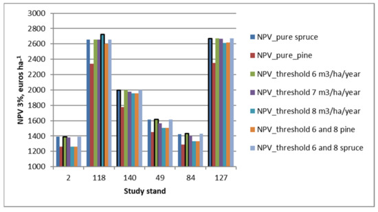In all study stands, the NPV (3%) of pure Norway spruce stands was clearly higher than that of pure Scots pine stands (Figure 3). In four out of six cases, the NPV (3%) of mixed stands (i.e., combinations of micro-stands) was slightly higher than that of pure Norway spruce stands. All these mixed stands were Norway spruce-dominated, and they were treated according to silvicultural guidelines of Norway spruce-dominated stands. In one study stand (no. 118), the NPV (3%) was significantly higher with the option where the stand was planted with two tree species (delineation with a threshold value of 8 m3/ha/year) rather than with one tree species. On the other hand, in all study stands, there existed a mixed stand solution or solutions which gave about the same NPV (3%) as the pure Norway spruce stand.