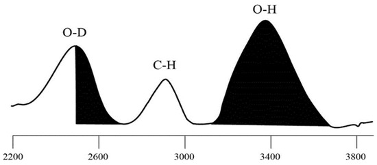 Studies on deuterated wood with infrared spectroscopy showed an increase in O–D bond stretching (height wavenumber around 2510 cm−1) and a decrease in O–H bond stretching (around 3200–3600 cm−1), whilst the C–H bond stretching at around 2900 cm−1 remained the same as in the non-deuterated case [24,25,26,27,28]. The relative accessibility of hydroxyl groups can be determined using FTIR as the area under the FTIR curve, represented by the bond stretching of O–D to the sum of the area of the bond stretching of O–D and O–H [25,29,30]. The results from using this method can be influenced by exposure of fresh cut specimens to the moist air, which can lead to re-protonation of deuterated hydroxyl groups. However, reliable and reproducible results can be obtained by a careful experimental design [30].