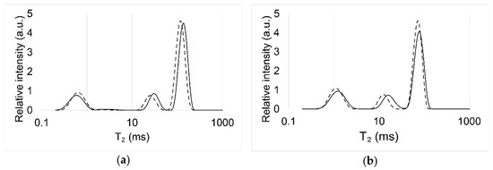 Previous studies on modified wood showed changes in the interaction between water compared to unmodified wood [8]. Acetylated wood showed a reduced peak area of cell wall water at the water-saturated condition compared to that of unmodified wood [20], which indicated a reduction in the maximum amount of water absorbed in cell walls due to acetylation. An increased T2 relaxation time was observed for various modifications and was concluded to be due to a decreased hydrophilicity of the cell wall [9,18,20,31].