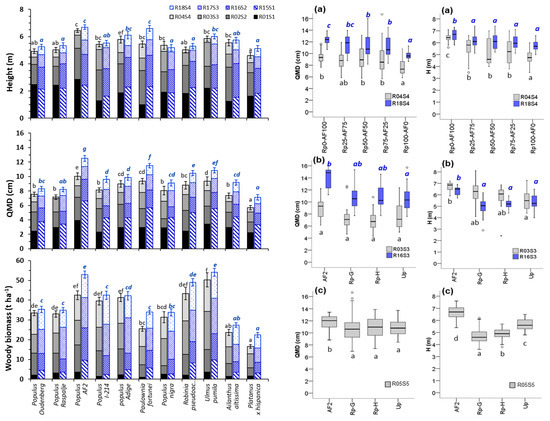 (Left) Mean annual values of plant height (H), quadratic mean diameter (QMD) and woody biomass dry weight of the aboveground part (AGWB) for the eleven taxa assessed in the Mo1 trial. The bars indicate the standard error (SE) at the end of the fourth year of each rotation (R04S4 the 1st rotation, and R18S4 the 2nd one); (Right) Boxplots of quadratic mean diameter (QMD) and plant height (H) in the Mo2 (a), Ra4 (b) and Mo3 (c) trials for the last year of each rotation. First rotation (grey colors) and second rotation (blue color). Different letters indicate significant differences between taxa or treatments (p < 0.001) at the end of each rotation (black letters for the 1st rotation; italic blue letters for the 2nd rotation). AF2 (Populus × euroamericana “AF2”), Rp-H and Rp-G (Robinia pseudoacacia cultivar “Nyírségi” and German provenance, respectively); Up (Ulmus pumila). Treatments: 100% AF2 (Rp0-AF100); 25% Rp-G + 75% AF2 (Rp25-AF75); 50% Rp-G + 50% AF2 (Rp50-AF50); 75% Rp-G + 25% AF2 (Rp75-AF25); 100% Rp-G (Rp100-AF0).
