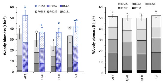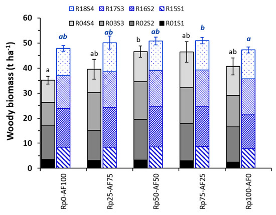 Mean annual values of woody biomass dry weight of the aboveground part of the plant (AGWB) for the four mixture treatments assessed in the Mo2 trial. First rotation (grey colors) and second rotation (blue color). The bars indicate the standard error (SE) at the end of the fourth year of each rotation (R04S4 for the 1st rotation, and R18S4 for the 2nd). Different letters indicate significant differences between treatments (p < 0.001) at the end of each rotation (black letters for the 1st rotation; italic blue letters for the 2nd rotation). Treatments: 100% AF2 (Rp0-AF100); 25% Rp-G + 75% AF2 (Rp25-AF75); 50% Rp-G + 50% AF2 (Rp50-AF50); 75% Rp-G + 25% AF2 (Rp75-AF25); 100% Rp-G (Rp100-AF0).