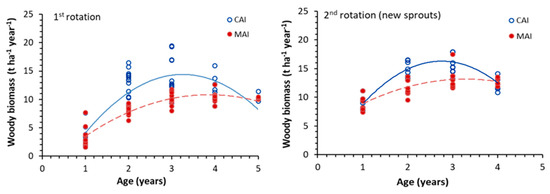 Current annual increment (CAI) and mean annual increment (MAI) of the woody biomass dry weight of the aboveground part of the plant (AGWB) throughout the period studied for the 1st and 2nd rotations. Data from all field trials and four taxa are shown as a whole. Taxa: AF2 (Populus × euroamericana “AF2”), Rp-H and Rp-G (Robinia pseudoacacia cultivar “Nyírségi” and German provenance, respectively); Up (Ulmus pumila). Equations of the fit lines: (i) 1st rotation, y = −2026x2 + 13,185x − 7043 (R2 = 0.69) for CAI, and y = −0.894x2 + 6902x − 2487 (R2 = 0.85) for MAI; (ii) 2nd rotation, y = -2427x2 + 13,381x − 2151 (R2 = 0.65) for CAI, and y = −0.824x2 + 5413x + 4280 (R2 = 0.62) for MAI.