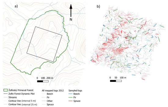 (a) Location of the Zofin Forest Dynamic Plot within the Žofínský Primeval Forest, contour lines from ČÚZK [36]; (b) Map of downed logs (mapped in 2012) and sampled logs according to tree species.