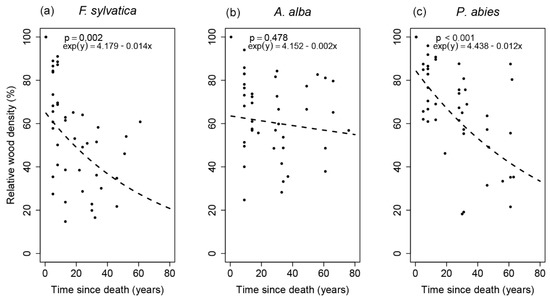 Changes in the relative wood density during TSD are shown in Figure 2 as exponential regression model. Values of relative wood density were normally distributed according to the Anderson–Darling test for all tree species. Although the exponential model was statistically significant for F. sylvatica and P. abies, it was not significant for A. alba. Spruce showed the highest R-squared (R2 = 0.299). Although F. sylvatica and P. abies logs had a decreasing change in relative wood density during TSD according to the regression model, the values of relative wood density of A. alba logs practically did not change during TSD.