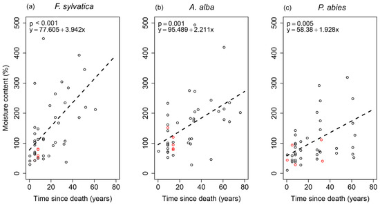 Linear regression models between the moisture content and time since death for each tree species: (a) F. sylvatica; (b) A. alba; (c) P. abies. Red circles—logs without ground contact.