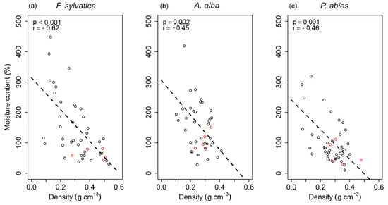 Correlation between the moisture content and wood density for each tree species: (a) F. sylvatica; (b) A. alba; (c) P. abies. Red circles—logs without ground contact.