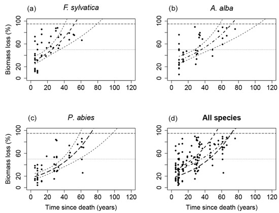 Exponential models of the decomposition rate and half-life based on the biomass loss of downed logs for each tree species (a) F. sylvatica; (b) A. alba; (c) P. abies. (d) Logs of all tree species together with the line type according to the tree species: dashed line—F. sylvatica; dash-dotted line—A. alba; long-dashed line—P. abies.