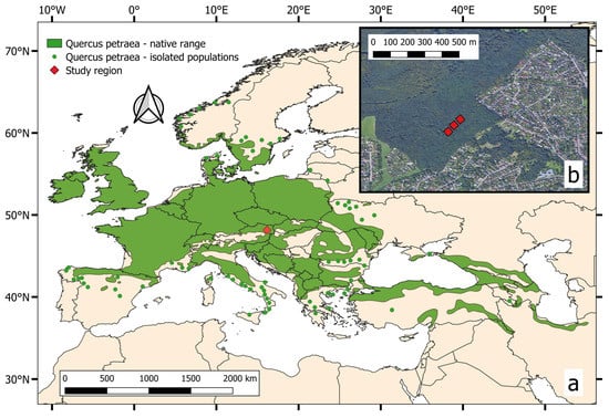 - Caudullo, G.; Welk, E.; San-Miguel-Ayanz, J. Chorological maps for the main European woody species. Data Br. 2017, 12, 662–666. [Google Scholar] [CrossRef]
