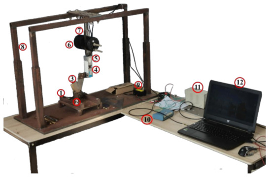 Schematic diagram of the structure of the pendulum-cutting test bench. 1. Support frame; 2. Branch fixture; 3. Cutting tool; 4. Foot-standing sensor; 5. Posture Euler angle sensor; 6. Counterweight block; 7. Pendulum 8. Table frame; 9. Transmitter; 10. Data acquisition card; 11. power supply; 12. Notebook.