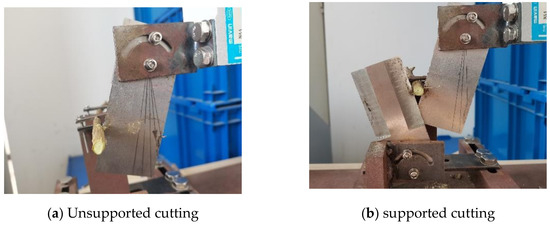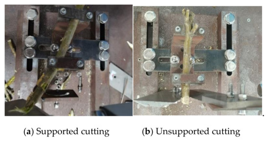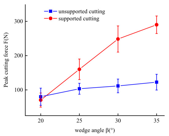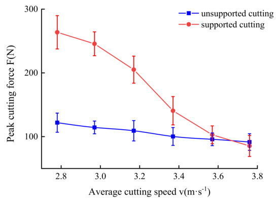 During unsupported cutting, when the cutting speed increases, the chipping angle does not change significantly (Figure 8a), it makes the peak cutting force change value relatively small. While the supported cutting process, as shown in Figure 8b, the cutting direction of the wedge is always perpendicular to the direction of the axis of the branch (cross-cutting). When the cutting speed gradually increases, the branch transfer deformation time at the cutting point is shortened, it results in a gradual decrease in peak cutting force. When the cutting speed continues to increase, the branch transfer deformation time no longer changes significantly and the decrease trend is relatively flat [40].