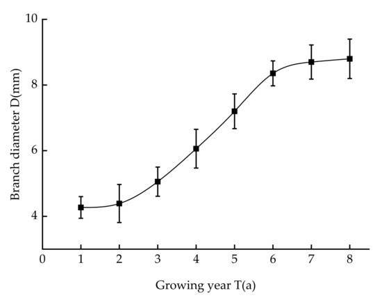 From Figure 4, it can be concluded that the overall diameter of the C.k. branches gradually increased with the growth year, which is in line with the conventional perception. The growth rate of branch diameter was more obvious in the years of the C.k. growth from 2 to 6a. When the growth year was greater than 6a, the growth rate was essentially flat. During the stubble cycle (3–5a) of the C.k., their diameters range from 5 to 8 mm.