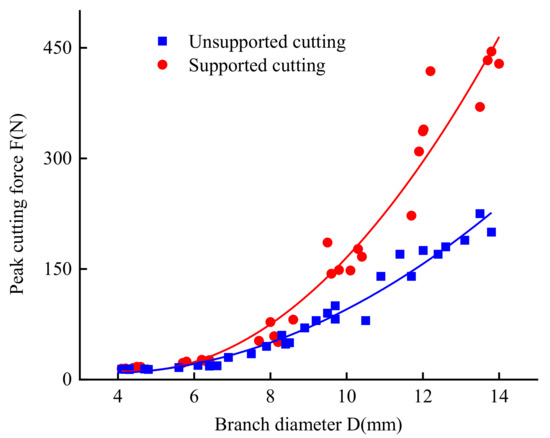 Relationship between the C.k. branch diameter and peak cutting force. Note: average cutting speed is 3.36 m·s−1; wedge angle is 25°; slip cutting angle is 20°; cutting gap is 1 mm; cutting height is 5 cm; moisture content is 26.4%–29.2%.