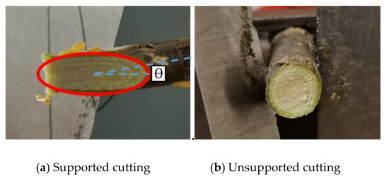 As shown in Figure 6, the branch cutting process was recorded by the camera and it was found that the section of the unsupported cut was elliptical and skewed at an angle to the axis of the branch (chipping angle), while the section of the supported cut was circular and perpendicular to the axis of the branch. At a certain branch diameter, the peak cutting force is relatively small during unsupported cutting. Due to the unsupported cutting process, the shear force will cause the branch to bend, so that the cutting direction of the blade has a certain angle with the direction of the branch axis, so that the cross-sectional area increases and the peak cutting force decreases.