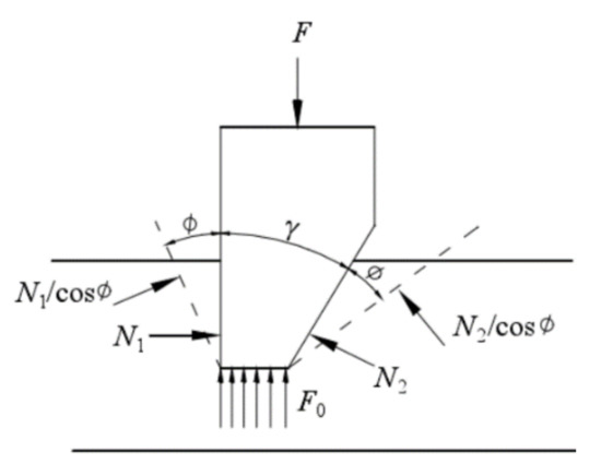 The tool edge is a one-sided wedge angle, and when the cutting tool cuts into the branch, the equilibrium conditions in the horizontal and vertical directions are:
