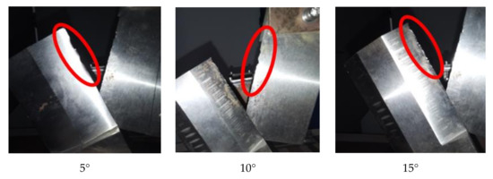 As shown in Figure 11, the blade with 5°, 10° and 15° wedge angles all suffered different degrees of wear damage during the test. Therefore, the tool edge strength and tool life need to be taken into account when designing optimized cutting tools.