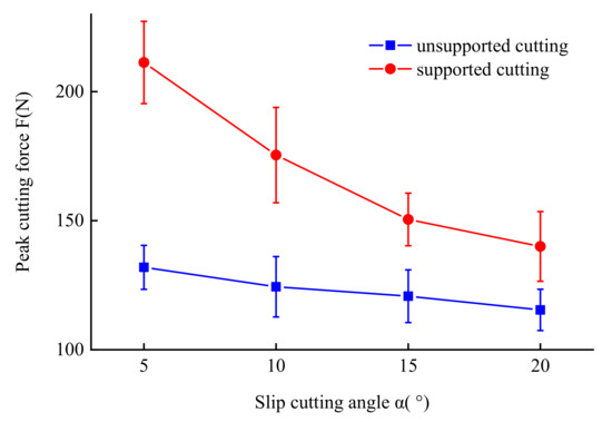 The peak cutting force decreases with increasing tool slip cutting angle (Figure 12). Since the tool is subjected to a positive pressure perpendicular to the edge and a lateral force parallel to the edge when cutting the branch, the relative slip between the branch and the edge increases when the slip cutting angle increases, thus enhancing the cutting action of the edge on the branch and reducing the peak cutting force (Figure 13). In contrast, during unsupported cutting, the trend of reduction of peak cutting force is relatively flat due to the relatively small trend of variation of chipping angle with tool wedge angle [37].