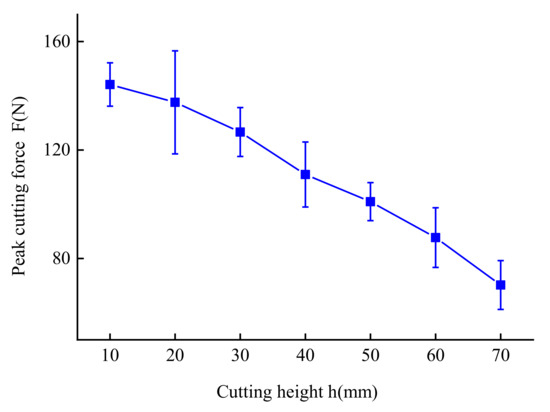Cutting height versus peak cutting force. Note: branch diameter is 9–10 mm; wedge angle is 25°; average cutting speed is 3.36 m·s−1; slip cutting angle is 20°; cutting height is 5 cm, moisture content is 26.8%–28.9%.