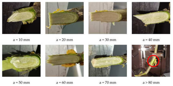 - Mathanker, S.K.; Grift, T.E.; Hansen, A.C. Effect of blade oblique angle and cutting speed on cutting energy for energycane stems. Biosyst. Eng. 2015, 133, 64–70. [Google Scholar] [CrossRef]