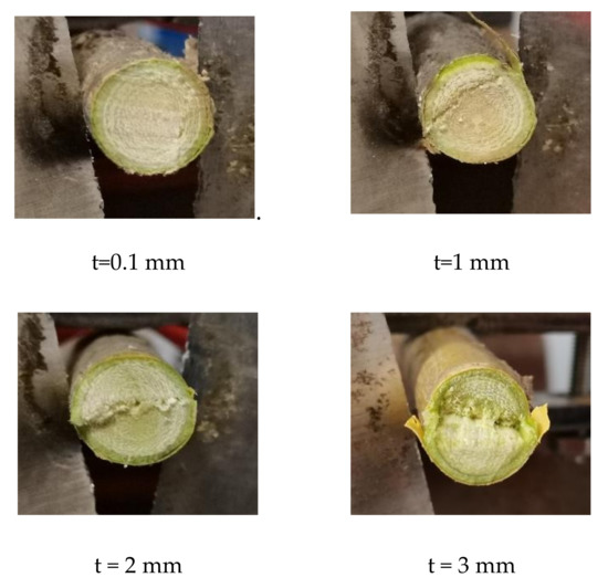 The peak cutting force tends to decrease and then increase as the cutting gap increases for a certain number of other parameters (Figure 17). When the cutting gap is less than a certain value, the branch shear zone ratio is larger, the fracture zone is smaller and the peak cutting force required is larger. When the cutting gap is greater than a certain value, the proportion of shear zone decreases, the proportion of fracture zone increases, and the required peak cutting force is relatively large. Only when the shear zone and fracture zone overlap (i.e., when the cutting gap is about 1 mm), the peak cutting force is minimal and the quality of the cut section is good, with no tearing and flat stubble. The cut sections at different cutting clearances are shown in Figure 18.