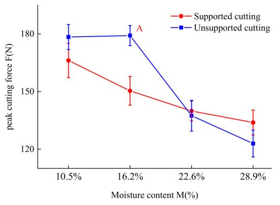 Relationship between moisture content and peak cutting force. Note: branch diameter is 9–10 mm; wedge angle is 25°; cutting speed is 3.36 m·s−1; slip cutting angle is 20°; cutting height is 5 cm.