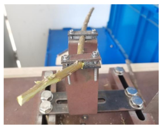 In the stubble cycle of C.k. (3–5 years), while most branches usually do not exceed 10 mm, in order to study the relationship between branch diameter and peak cutting force more completely, the range of branch diameter D in the single-factor experiment was 4–14 mm and set to six levels; when conducting other group tests, branch diameter was taken as 9–10 mm. When the cutting speed is large, there is an operational risk, so in the single-factor test of average cutting speed, the average cutting speed is taken as 2.37–3.76 m·s−1 and set to six levels; when the single-factor test of other groups is conducted, the average cutting speed is 3.36 m·s−1. From the slip-cutting theory [20,36], it is known that when the slip cutting angle is greater than 20°, branches will produce the phenomenon of external slip, so the slip cutting angle is set to 5°, 10°, 15° and 20° in the single-factor experiment of tool slip cutting angle for a total of four levels; when the other groups of single-factor tests are conducted, the slip-cutting angle is taken as 20° to ensure that the minimum cutting force is obtained. Comprehensive consideration of the wedge edge strength and blade life will be the relationship between the tool wedge angle single-factor experiment wedge angle set to 20°, 25°, 30°, 35°—a total of four levels [37,38]; when conducting the other single-factor test, the wedge angle was 25°. Referring to previous studies [3,19], the cutting gap was set from 0.1 to 3 mm and set to four levels in the single-factor test of cutting gap; when conducting other group tests, the cutting gap is taken as 1 mm. According to the biological characteristics of C.k., the stubble retention height is usually required to be no more than 8 cm from the ground to facilitate the sprouting rate of branches [4,5]. Therefore, the cutting height was set to 10–80 mm in the single-factor test, and set to 10 levels; when the other group tests were conducted, the cutting height was set to 50 mm.