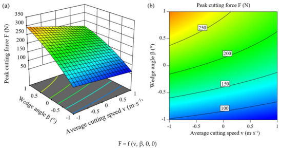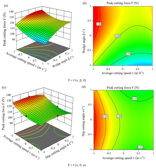 The regression equation was optimized using Design-Expert 11 software to obtain the best combination: average cutting speed v of 3.315 m·s−1, wedge angle β of 20° and slip cutting angle α of 20°, when the peak cutting force is 95.690 N.
