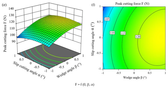According to the experimental results in Table 7, the effects of average cutting speed, tool wedge angle, slip cutting angle, cutting gap and their interactions on the target values can be obtained and the response surface plotted using Design−Expert 11 software (Figure 22). The peak cutting force decreases with the increase of average cutting speed and slip cutting angle; with the increase of tool wedge angle, the peak cutting also increases gradually; with the increase of cutting gap, the peak cutting force decreases first and then increases, and the peak cutting force reaches the minimum value when the cutting gap is 1 mm, which is consistent with the conclusion of single-factor test.