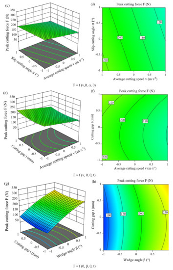 The effect of the interaction of the factors on the unsupported peak cutting force is shown in Figure 21. The peak cutting force decreases with the increase of average cutting speed and slip cutting angle, and the decreasing trend is gradually flat; with the increase of tool wedge angle, the peak cutting force gradually increases, which is basically consistent with the conclusion of single-factor test.