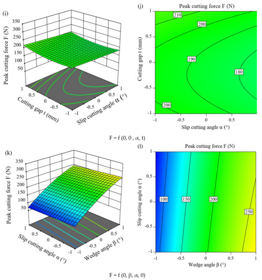 Response surface of interaction to peak cutting force (supported cutting). (a) Response surface under the interaction of Wedge angle and Average cutting speed. (b) Contour plot under the interaction of Wedge angle and Average cutting speed. (c) Response surface under the interaction of Slip cutting angle and Average cutting speed. (d) Contour plot under the interaction of Slip cutting angle and Average cutting speed. (e) Response surface under the interaction of Cutting gap and Average cutting speed. (f) Contour plot under the interaction of Cutting gap and Average cutting speed. (g) Response surface under the interaction of Cutting gap and Wedge angle. (h) Contour plot under the interaction of Cutting gap and Wedge angle. (i) Response surface under the interaction of Cutting gap and Sliding cutting angle. (j) Contour plot under the interaction of Cutting gap and Sliding cutting angle. (k) Response surface under the interaction of Slip cutting angle and Wedge angle. (l) Contour plot under the interaction of Slip cutting angle and Wedge angle.