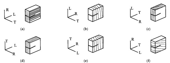 Possible crack propagation systems for wood (a) RL, (b) LR, (c) LT, (d) TL, (e) TR, and (f) TR.