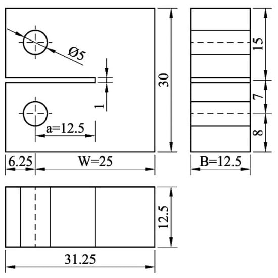 Following procedure described the way how to prepare CT samples. Firstly, the full-size wood lumbers were machined to 200 × 30 × 12.5 mm (length × width × thickness) in the middle part of the lumber, followed by cutting to 31.25 × 30 × 12.5 mm. Afterwards, two holes with diameter of 5 mm were drilled according to ASTM E 1820 [34], and then a 19 mm long × 1 mm thick gap was machined using a miniature band saw. Finally, a 1 mm-long prefabricated crack tip was cut by a thin and shaped knife. Figure 2 shows the specific dimensions of CT samples. All samples were stored for a week in the laboratory controlled in the chamber at 25 °C with a relative humidity of 65% and then tested in the same laboratory.