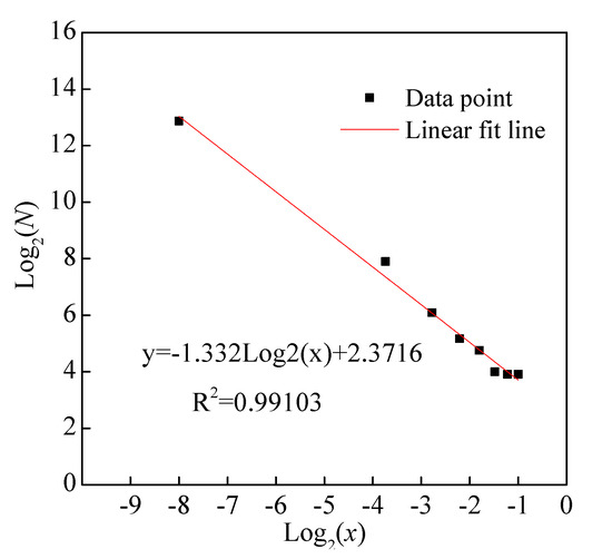 The main steps for calculating fractal dimensions of cracks using photos of failure samples were as followings: (1) the photos of cracks in front and left views, as well as photos of fracture surfaces of CT samples were transferred to grayscale images with a resolution of 600 dpi in TIF format; then (2) the box dimension method was applied to calculate fractal dimensions of these grayscale images through using Fraclab 2.2 toolbox (INRIA, France) built in the Matlab R2014a (MathWorks, Natick, MA, USA); and (3) the specific settings were that box sizes ranged from 1/2048 to 1/2, and the relationship between box sizes and corresponding numbers of box was fitted by linear logarithmic least square regression method as shown in Equation (1). The slop, D, of the fitting line was the fractal dimension [35,36]. Figure 4 shows an example for calculating fractal dimensions, which indicates that the fractal dimension is 1.332.