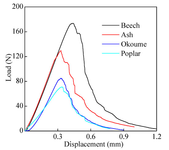 Figure 5 shows typical load-displacement curves in an RL system CT test of wood species evaluated in this work, which indicates that these curves experienced a linear elastic stage at initial stage before fracture, and then underwent a nonlinear stage at the fracture evolution stage. The maximum load was obtained at the initial crack point. Critical stress intensity factor could be calculated by Equation (2). For wood, previous studies have defined as shown in the following polynomial Equation (3) [33,39,40,41].
